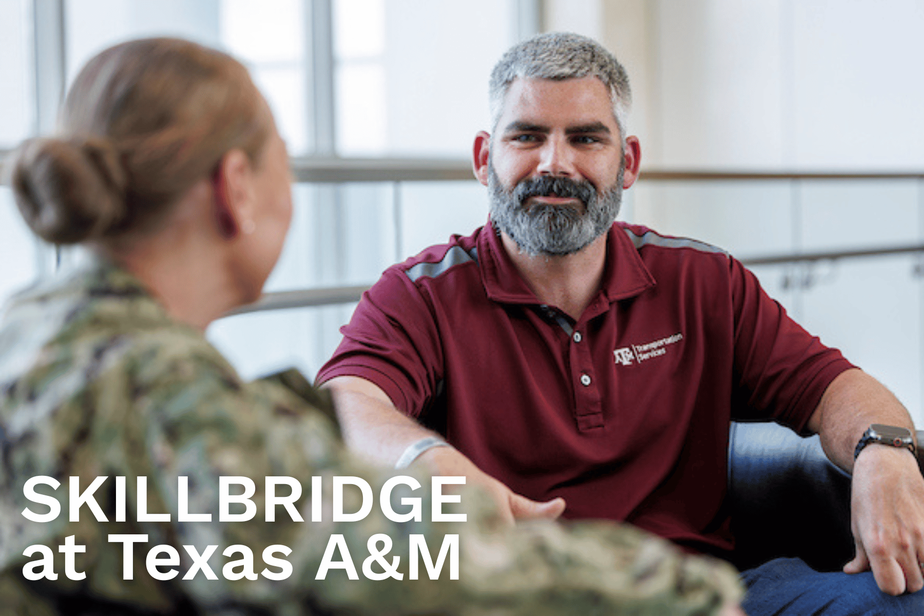 Texas A&M Stories shines a light on the SkillBridge Program, emphasizing how Aggie departments are opening doors for transitioning service members through real-world training and professional development on campus. The story highlights how the program helps service members translate their experience into civilian careers on campus and beyond. Texas A&M Stories Article >>